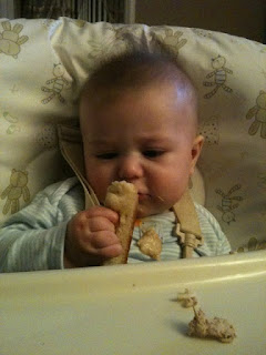 As I was stuck at home today on 'bed rest' (ha ha ha) I thought I might as well turn on the breadmaker. So I threw together some lentil and vegetable soup and a loaf. JC was well impressed with his first taste of bread. He chewed off a huge piece and started chewing away on it. His gag reflex is very good and he was able to spit out any bits he couldn't swallow. He sucked all the soup off the bread and then threw the remaining bits on the floor. At this rate Ruby and Kaiya will need gastric bands fitted!