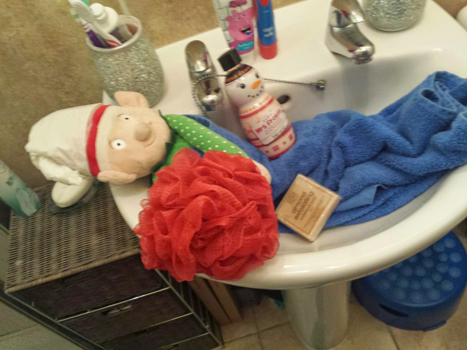 Buddy was feeling a little ruddy after his baking yesterday so he decided to have a bubble bath. He had his towel turban on and a bath towel round to protect his dignity. He brought with him some lovely new soap and snowman bubble bath. He is now smelling as fresh as a daisy.